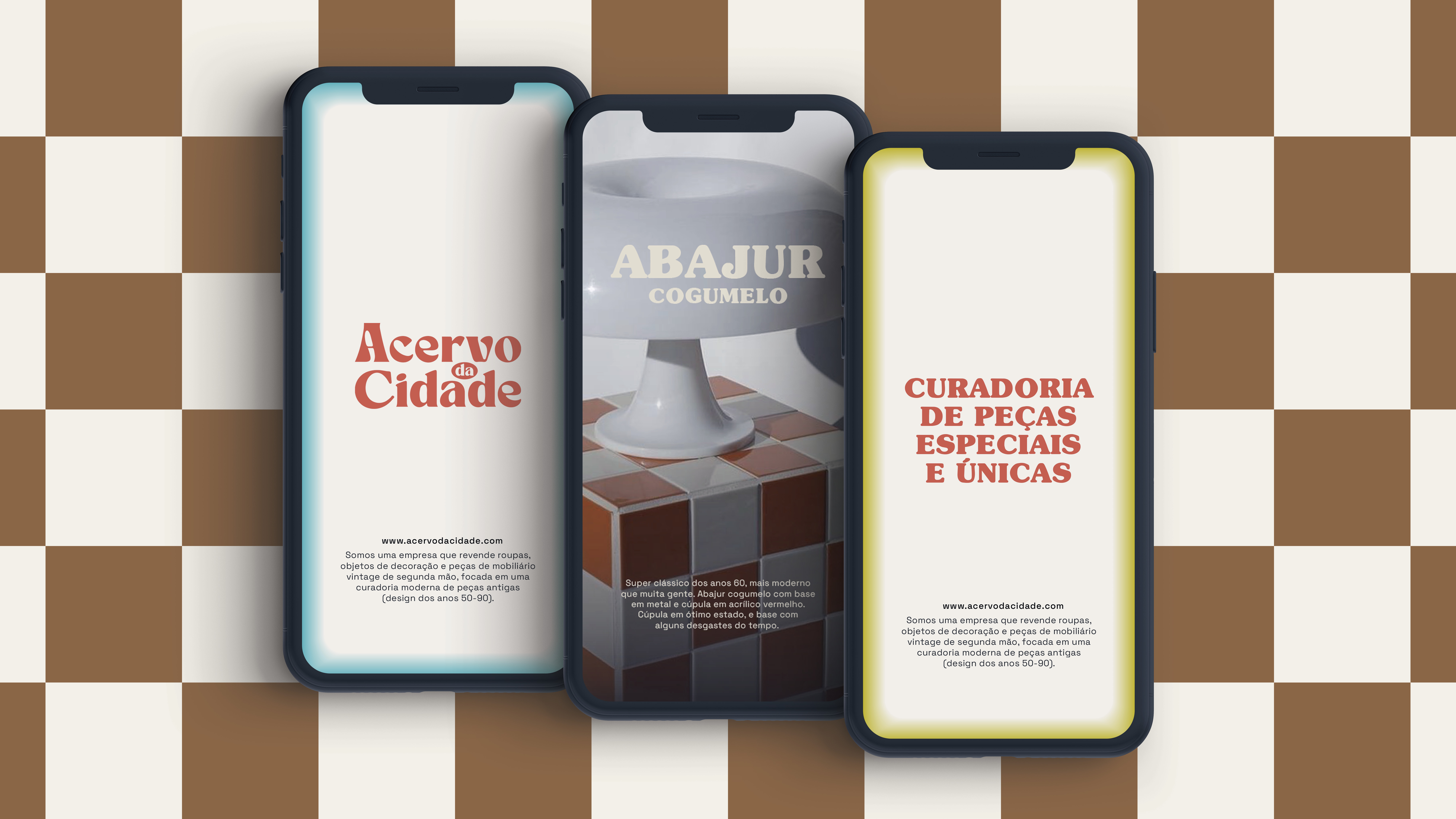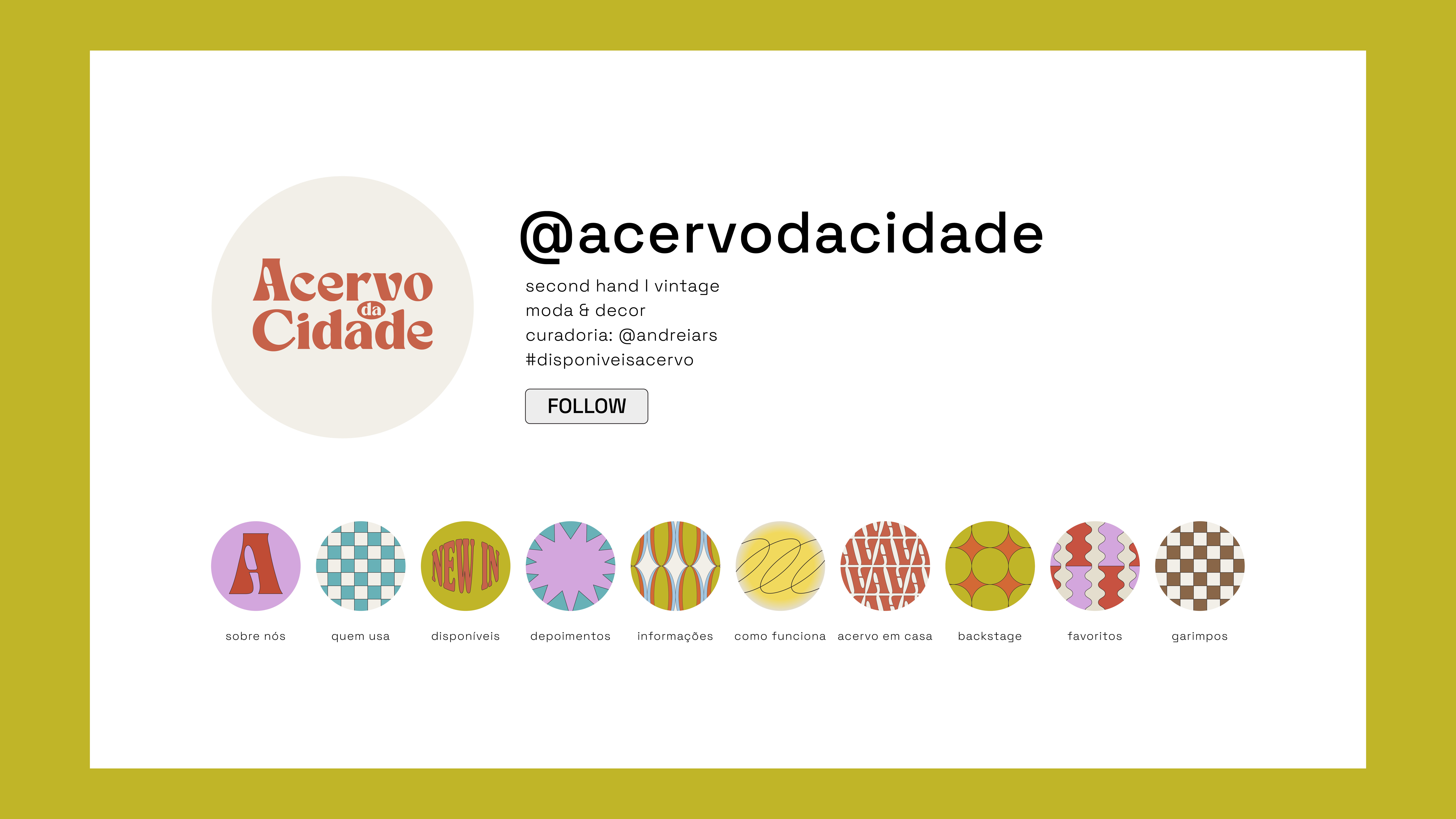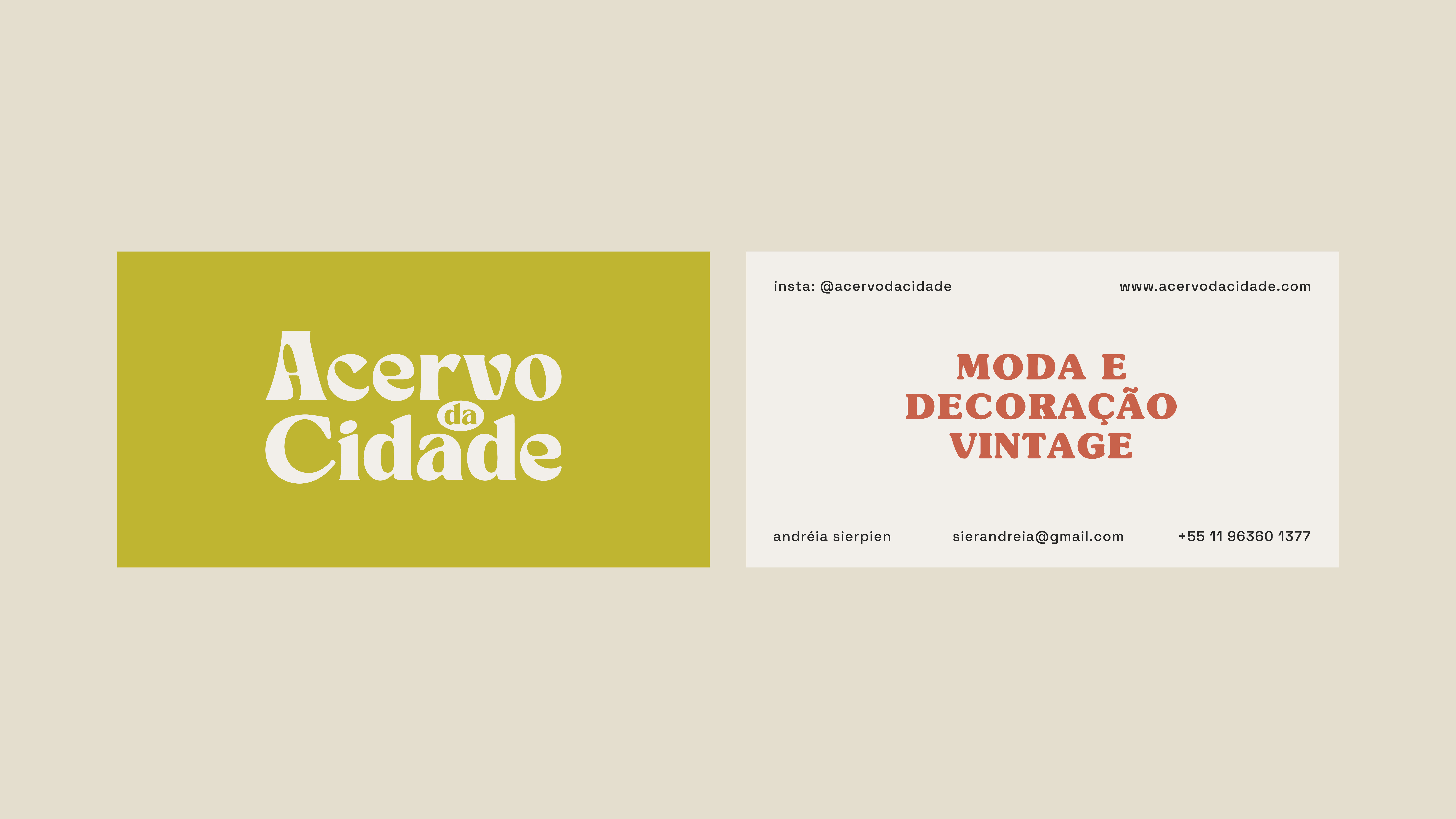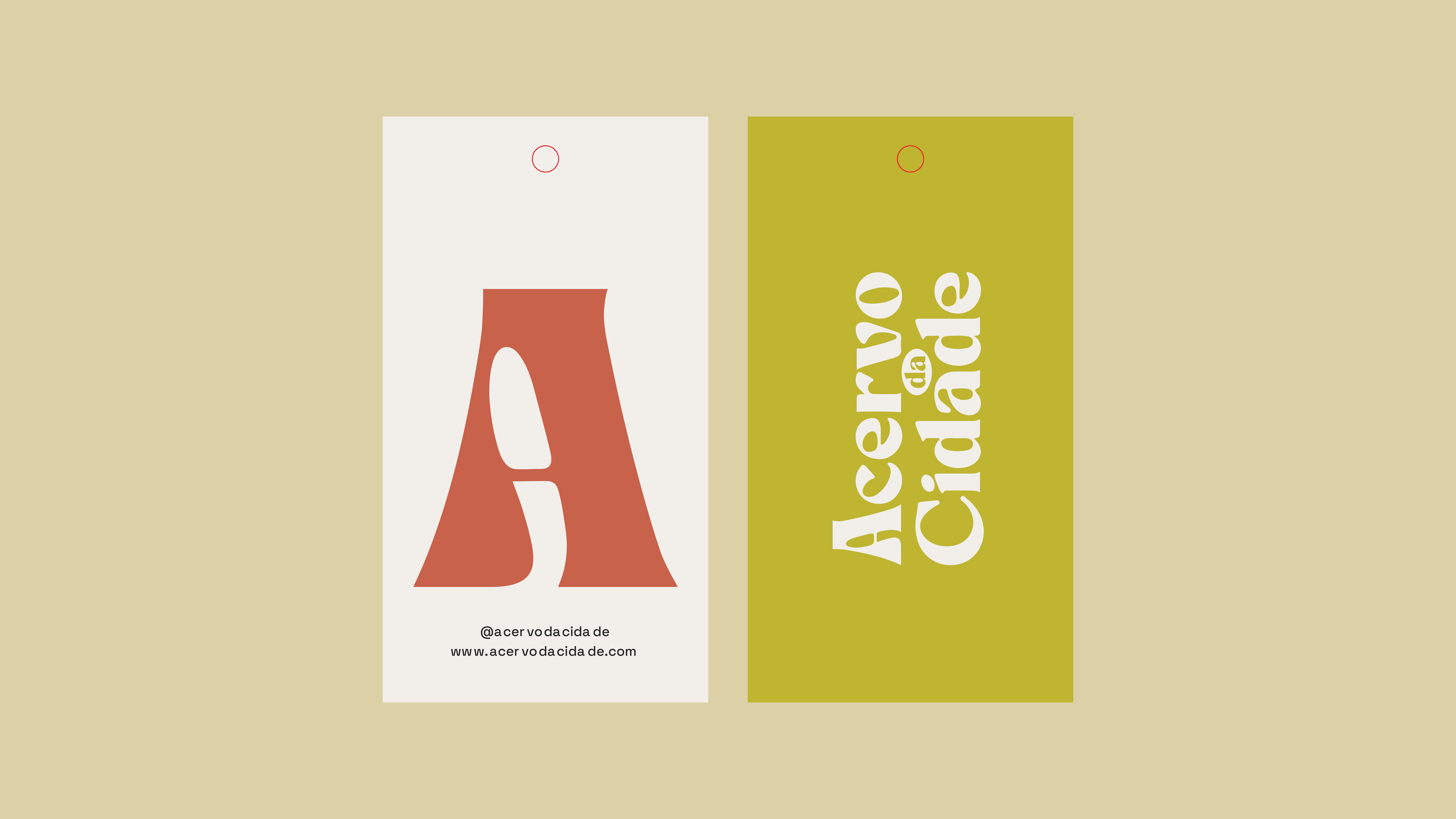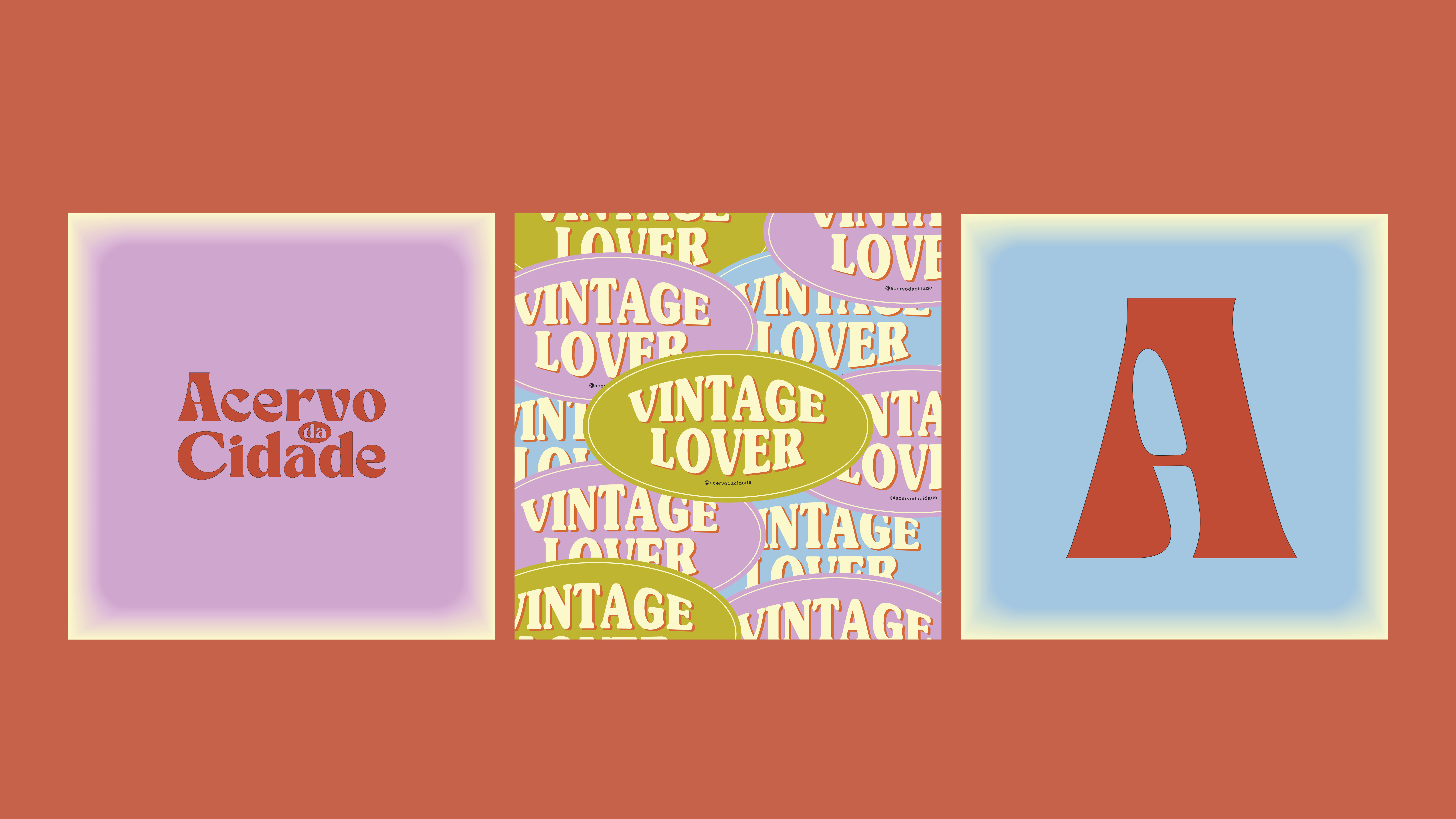 PT ✶ Projeto de identidade visual desenvolvido para o Acervo da Cidade, uma marca que revende roupas, objetos de decoração e mobiliário vintage de segunda mão, focada em uma curadoria moderna de peças antigas (design dos anos 50-90) com o objetivo de fomentar o mercado de reuso.