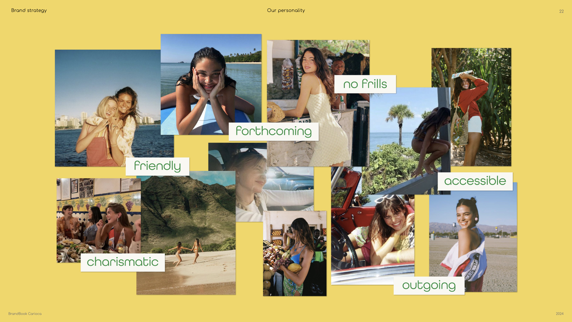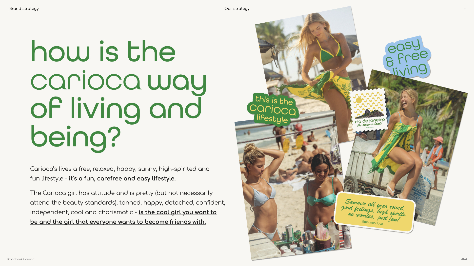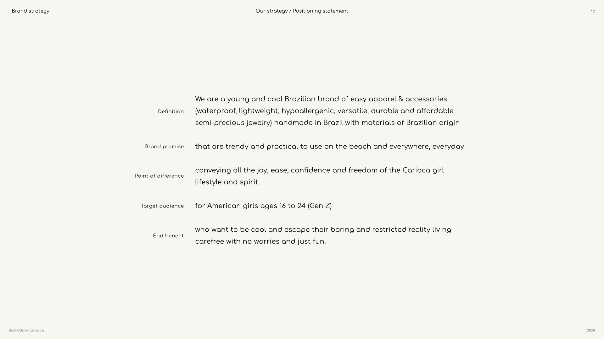 Considerando os seus benefícios de produto (roupas e acessórios estilosos e descomplicados para o dia a dia) e os desejos do público-alvo, definimos que a Carioca venderia mais do que roupas e acessórios — ela venderia o estilo de vida cool, leve, livre, divertido, despreocupado, confiante e cheio de borogodó das garotas do Rio de Janeiro.