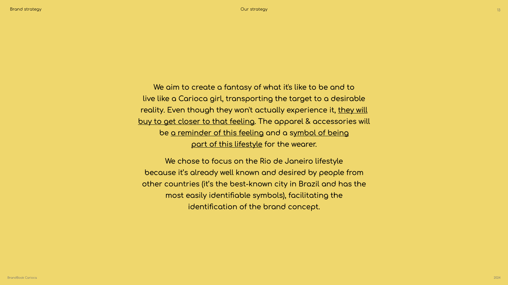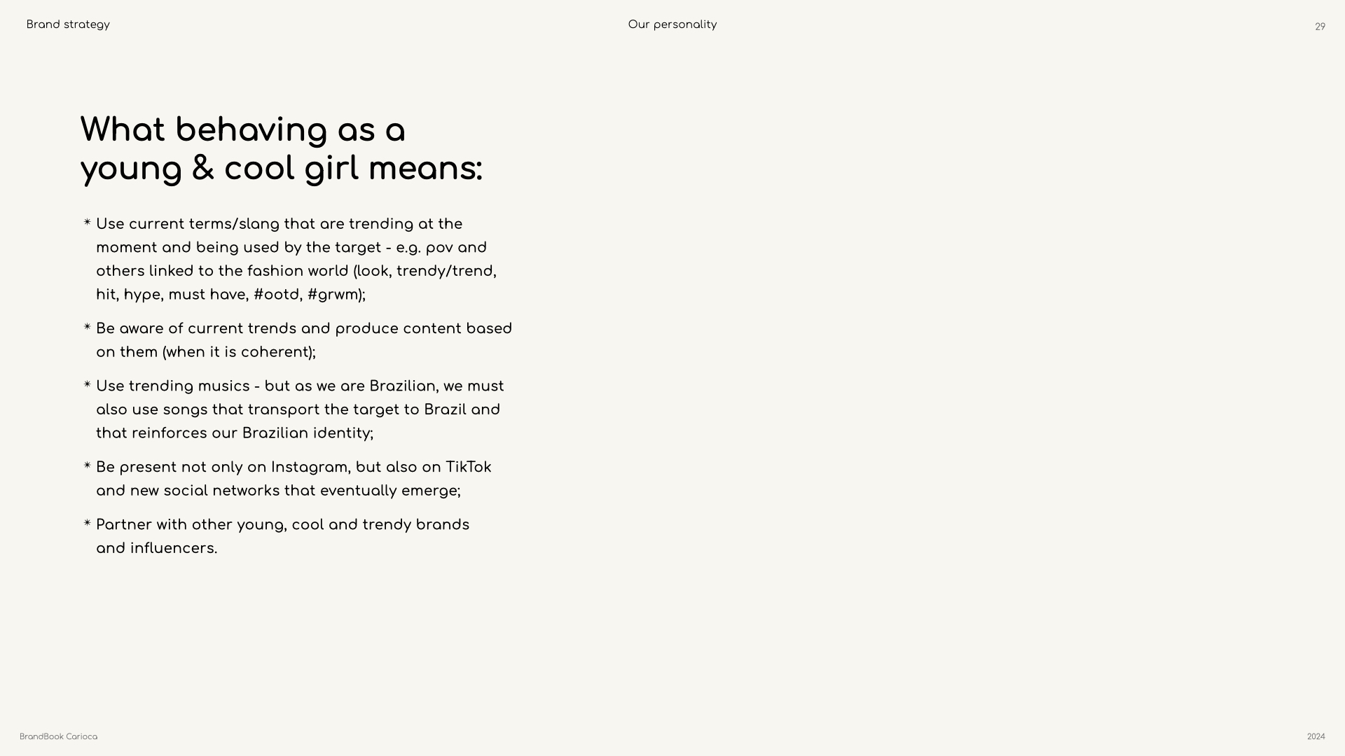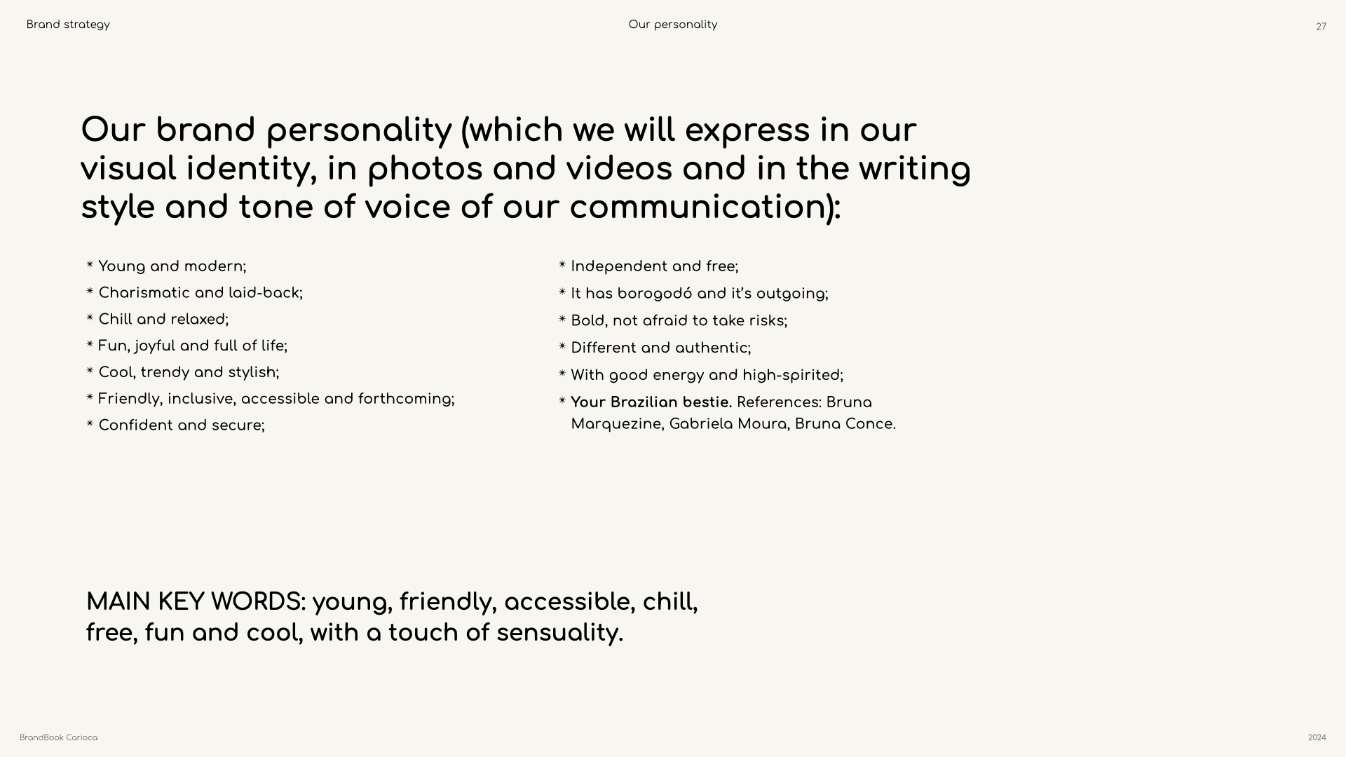 Considerando os seus benefícios de produto (roupas e acessórios estilosos e descomplicados para o dia a dia) e os desejos do público-alvo, definimos que a Carioca venderia mais do que roupas e acessórios — ela venderia o estilo de vida cool, leve, livre, divertido, despreocupado, confiante e cheio de borogodó das garotas do Rio de Janeiro.