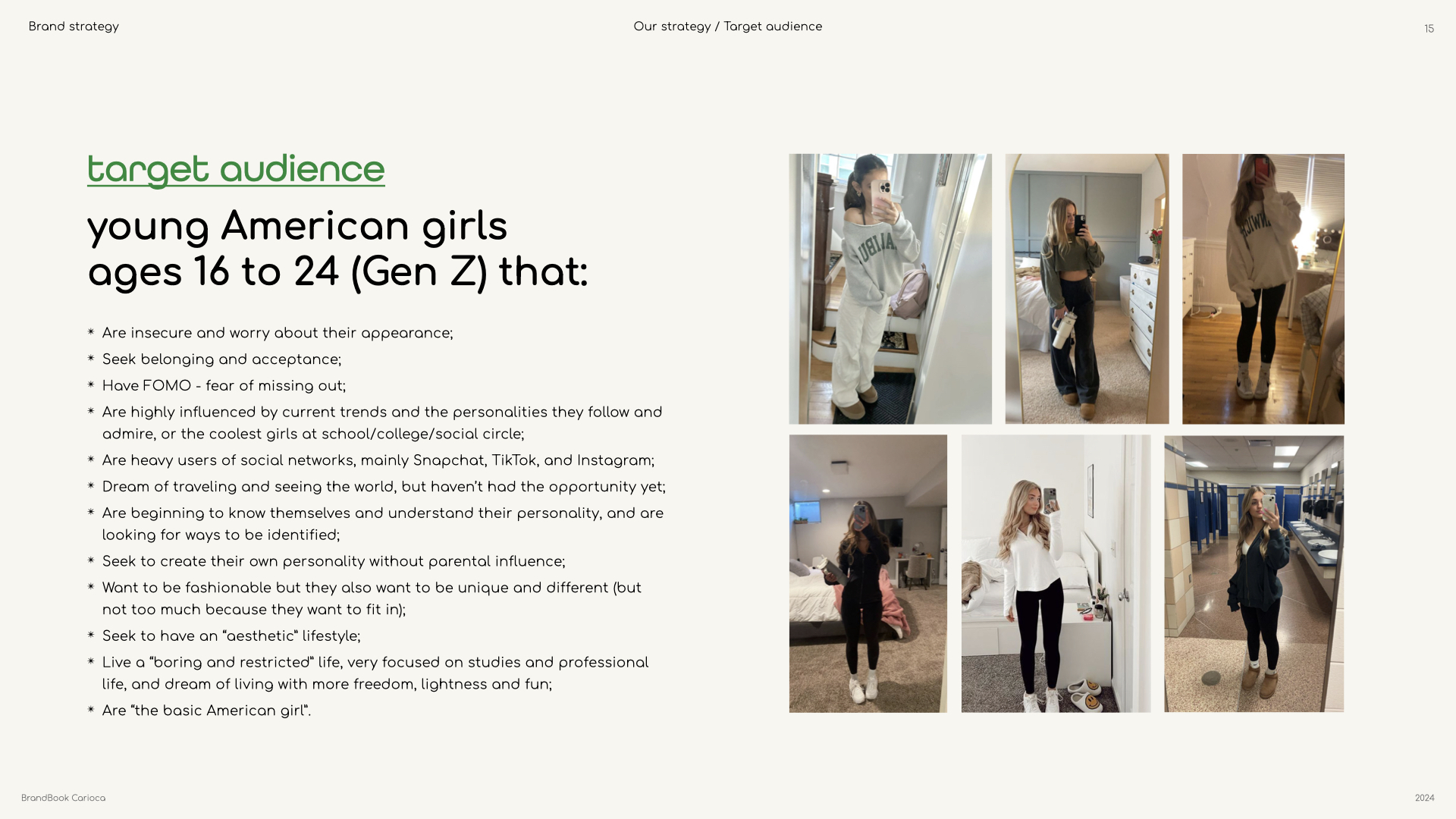 - PT ✶ A Carioca é uma marca de roupas e acessórios criada na Califórnia por duas brasileiras. Com um portfólio de produtos já estruturado e um público-alvo bem definido (jovens americanas de 16 a 24 anos), o desafio era construir uma base estratégica sólida e desenvolver uma identidade de marca que garantisse uma entrada impactante e coerente no mercado americano.