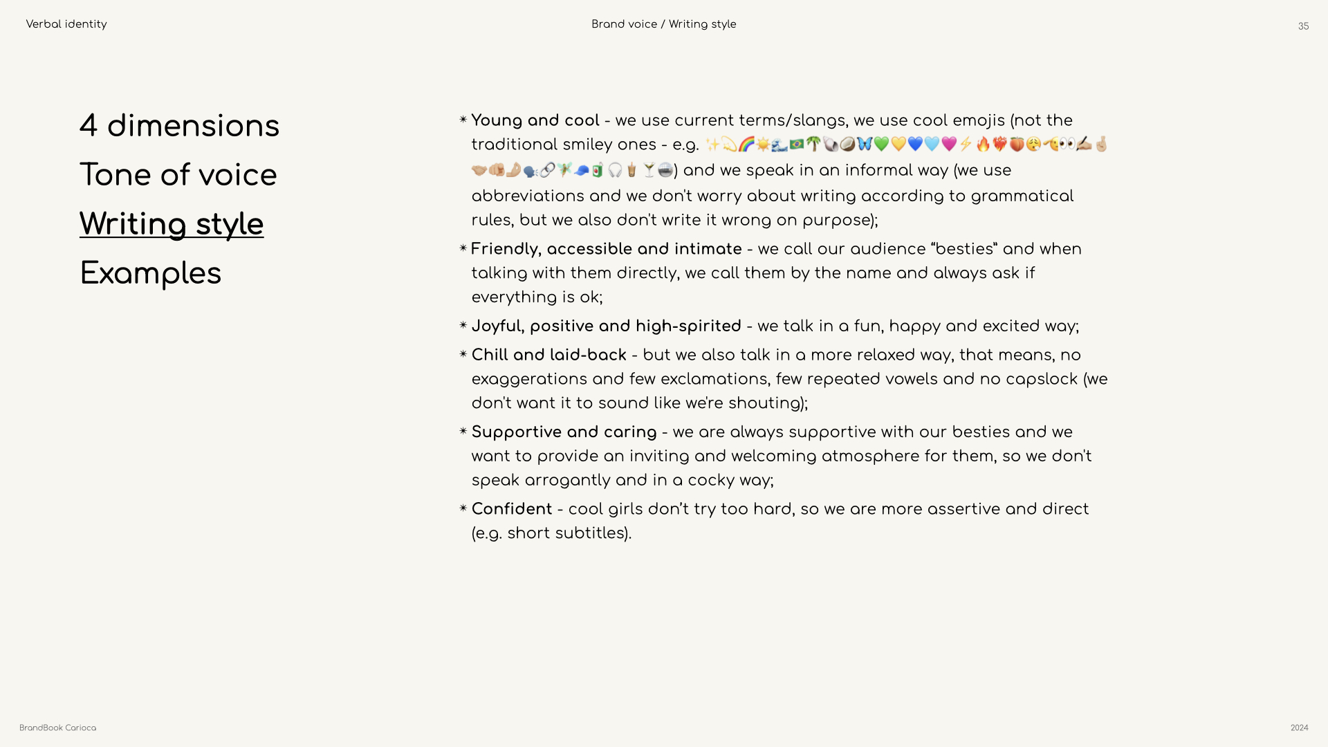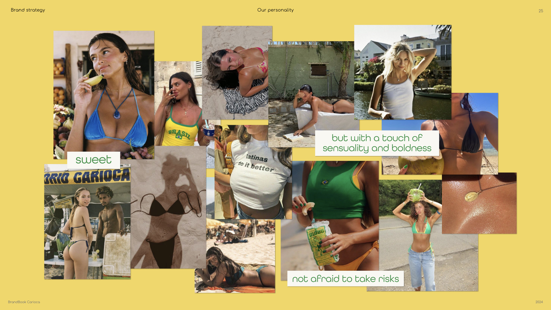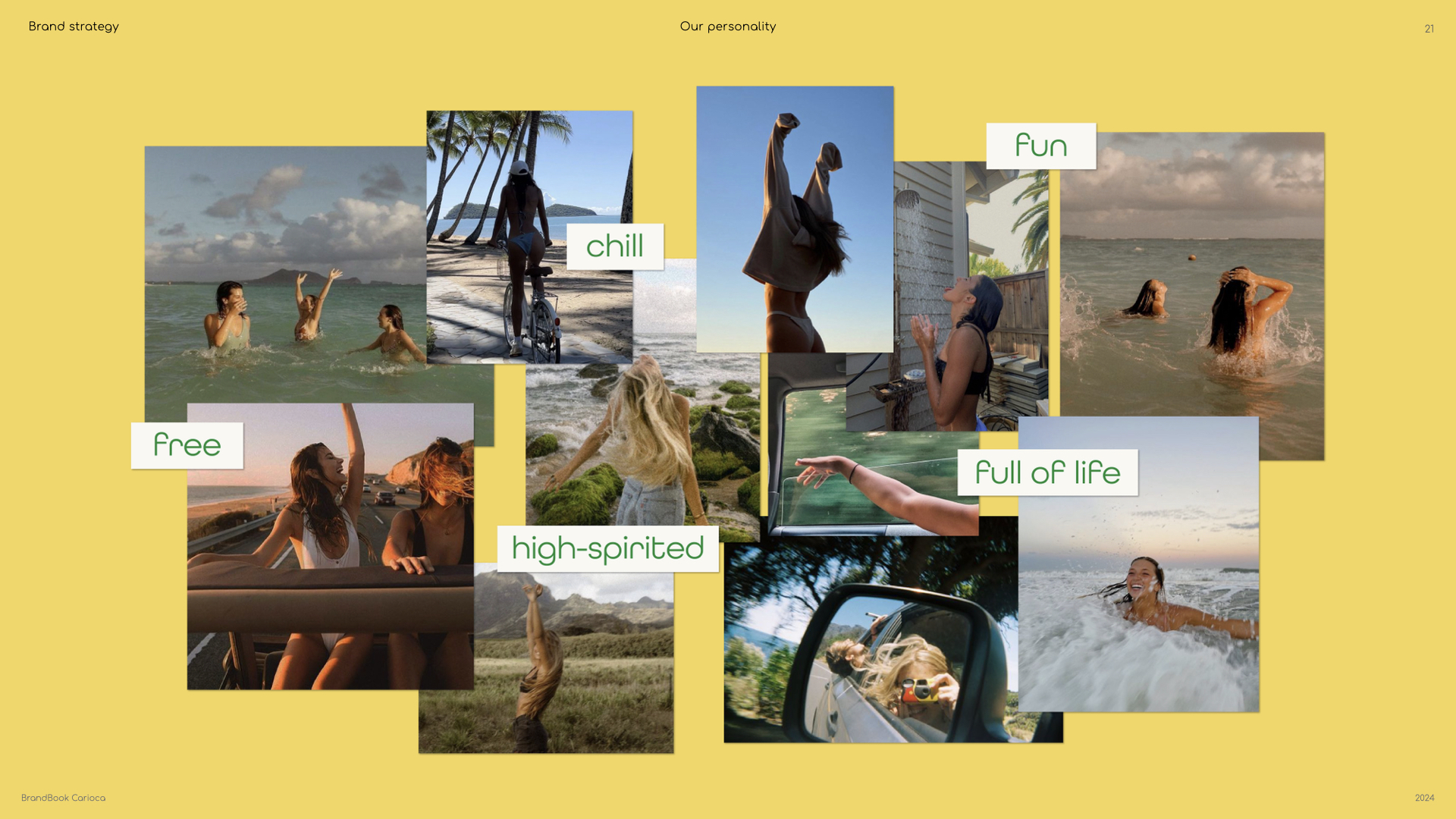 Para dar vida a esse posicionamento, a identidade verbal da marca foi construída com um tom leve, jovem, íntimo e divertido — como uma bestie brasileira falando direto do Rio. Já a identidade visual traduz esse lifestyle em cores solares, tipografias arredondadas, elementos gráficos inspirados no calçadão de Copacabana e fotografias com luz natural, cenários ao ar livre e poses espontâneas. Juntas, essas expressões criam um universo sensorial coeso e encantador, que convida o público a viver — mesmo que por um instante — como uma verdadeira Carioca.