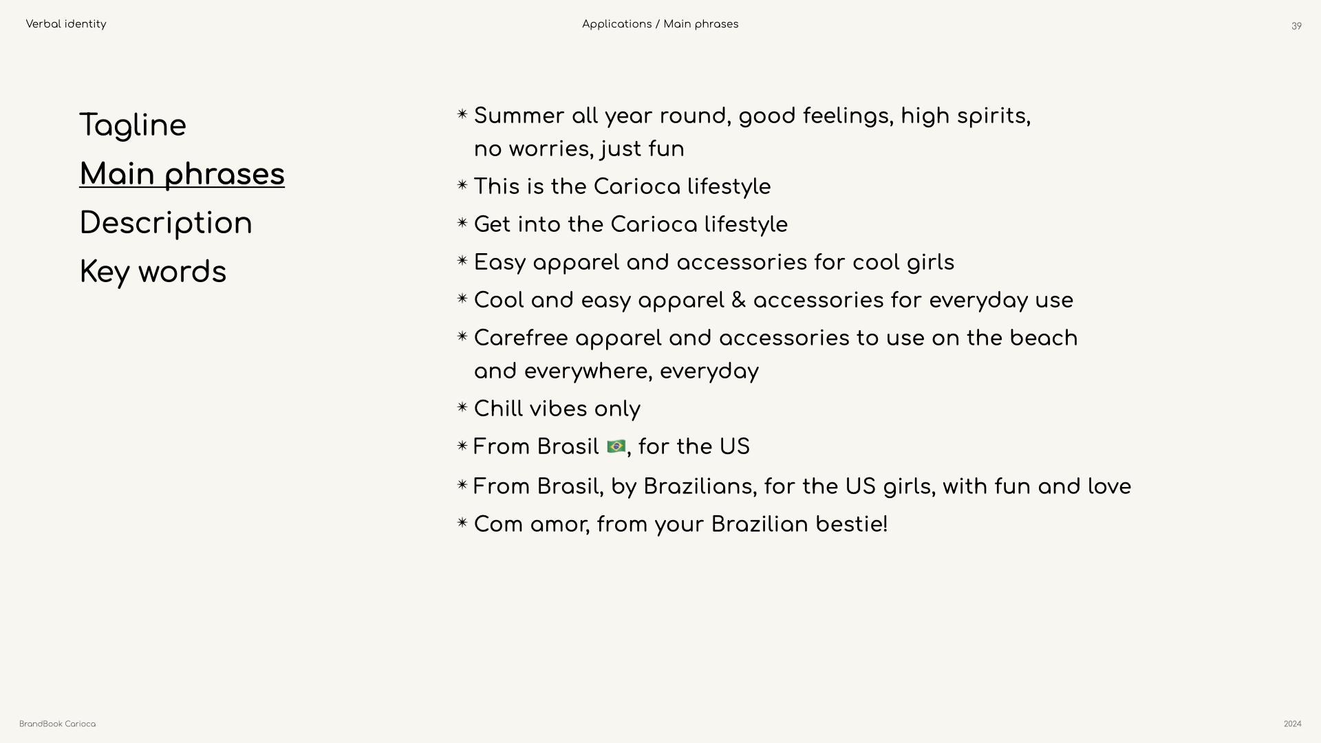 EN ✶ Carioca is a clothing and accessories brand created in California by two Brazilian women. With a well-structured product portfolio and a clearly defined target audience (young American girls aged 16 to 24), the challenge was to build a solid strategic foundation and develop a brand identity that would ensure a strong and coherent entry into the U.S. market.