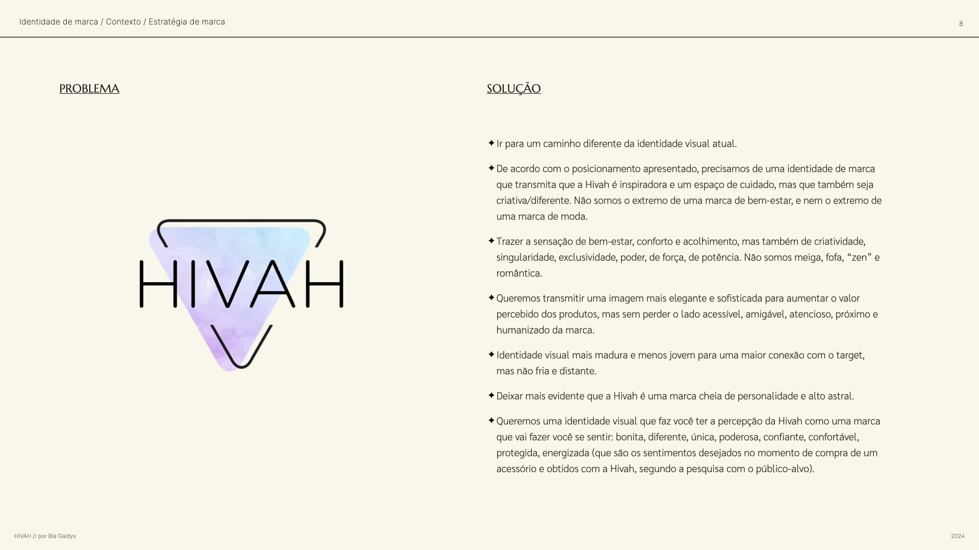 PT ✶ A Hivah é uma marca carioca de acessórios autorais feitos à mão com pedras naturais. Com peças elegantes, exclusivas e carregadas de significado, a marca já contava com reconhecimento no mercado, mas existia o desejo e a necessidade de se conectar com um novo público-alvo e de agregar valor aos seus produtos. Além de sua antiga identidade visual representar um ruído na percepção desejada, também faltava clareza por parte da gestão sobre o diferencial da Hivah, o que deveria ser destacado em seu discurso e quais movimentos e comportamentos eram coerentes com seus objetivos e público ideal.