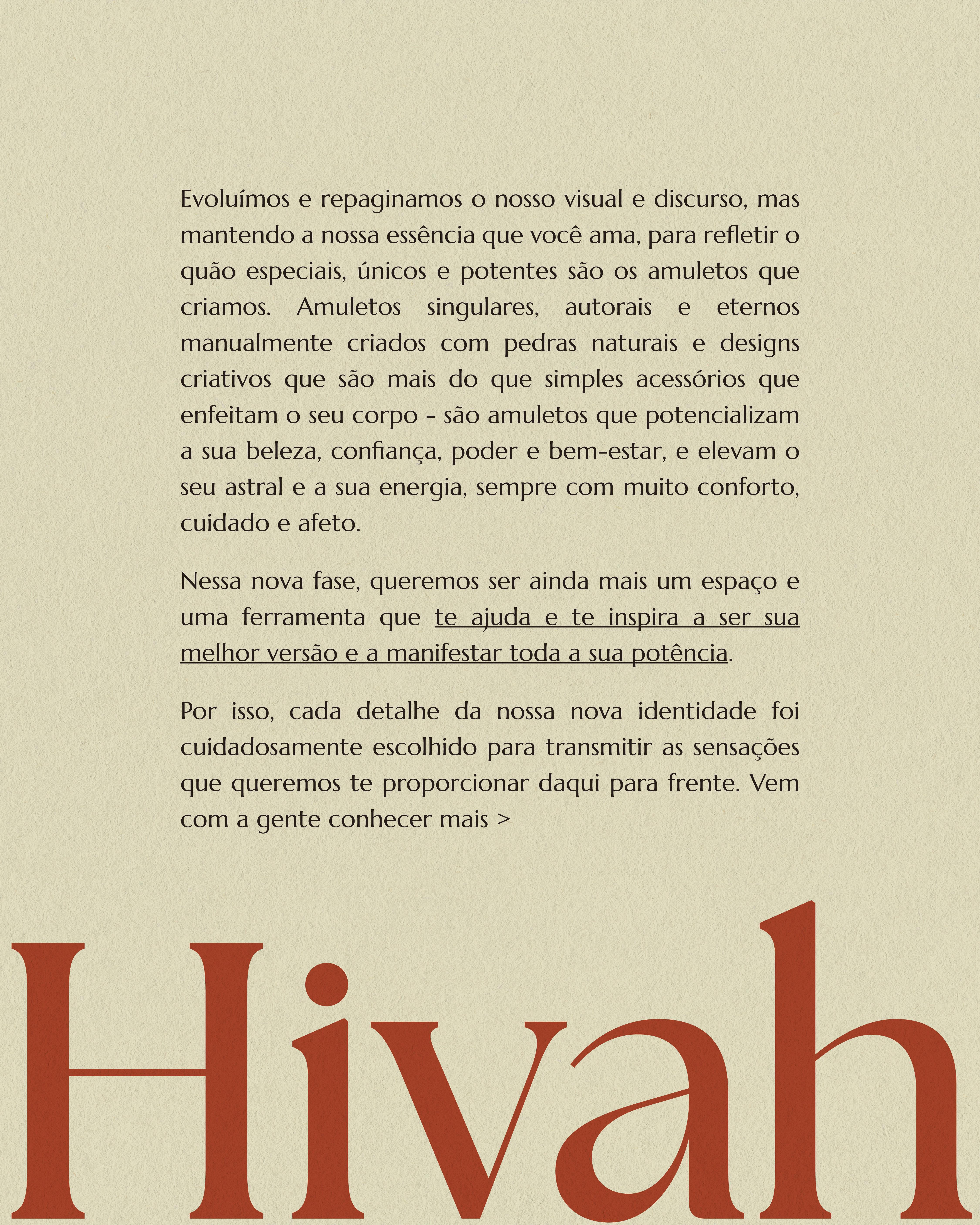 EN ✶ Hivah is a Rio de Janeiro-based brand of handcrafted, original accessories made with natural stones. With elegant, exclusive, and meaningful pieces, the brand was already recognized in the market — but there was both a desire and a need to connect with a new audience and to increase the perceived value of its products. In addition to an outdated visual identity that created friction with the desired perception, the brand also lacked internal clarity about what made Hivah truly unique, what should be highlighted in its messaging, and which behaviors and actions aligned with its goals and ideal audience.